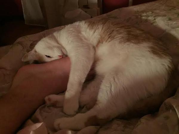 Спит он постоянно с хозяевами. Прям подхалим, не могу. Ломает стереотипы, что коты должны спать только в ногах и спит ВЕЗДЕ: на руке хозяина, на ноге, на голове, на шее, на лице… И все время так урчит, так урчит. Не любить его невозможно, но я его стараюсь сильно к себе не подпускать. Пусть не расслабляется.