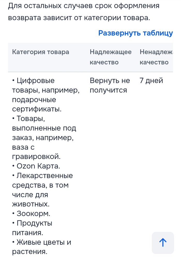 А товар действительно вернуть практически невозможно. Для возврата продуктов питания Озоном предусмотрен срок в сутки. Но - это для продуктов надлежащего качества (где-то пишут, что вообще нельзя). Если качество ненадлежащее, то вернуть товар по правилам самого Озона можно в течение 7 дней. К сожалению, по истечении суток сайт не даёт возможности оформить заявку на возврат товара ненадлежащего качества. Чат-бот поддержки гоняет по кругу и, как вишенка, чата с продавцом-Озоном тоже нет!
