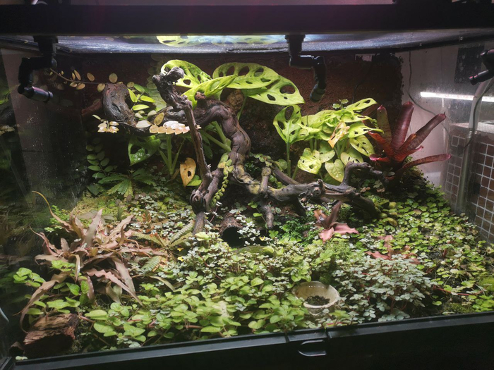 На заднюю стенку подсадил фикусы (минима и вайт-санни), потихоньку лезут на стенки.