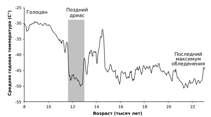 12900 лет назад климат Северного полушария катастрофически похолодал. Температуры упали на семь градусов за десятилетие. Ледники, отступавшие три тысячи лет, вновь начали наступать. Похолодание длилось 1300 лет. Геологи называют этот период «поздним дриасом» по массовому распространению дриады восьмилепестной, чья пыльца доминирует в отложениях с концентрацией, которую не показывает ни одно другое растение.