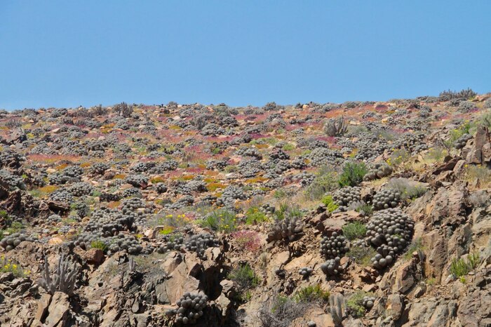 Пустыня Атакама в полном цвету. Редкое явление — Desierto Florido, когда выпадает достаточно осадков, и все растения и семена оживают и обильно цветут. На фото запечатлены густые кусты Copiapoa Dealbata. Korben Copiapoa Club