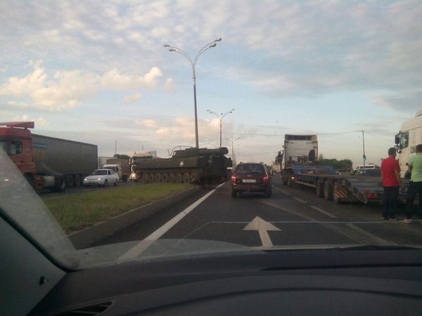 На месте ДТП находятся инспекторы ГИБДД, которые выясняют обстоятельства происшествия. Откуда и куда везли военную технику, неизвестно. В результате инцидента никто не пострадал».