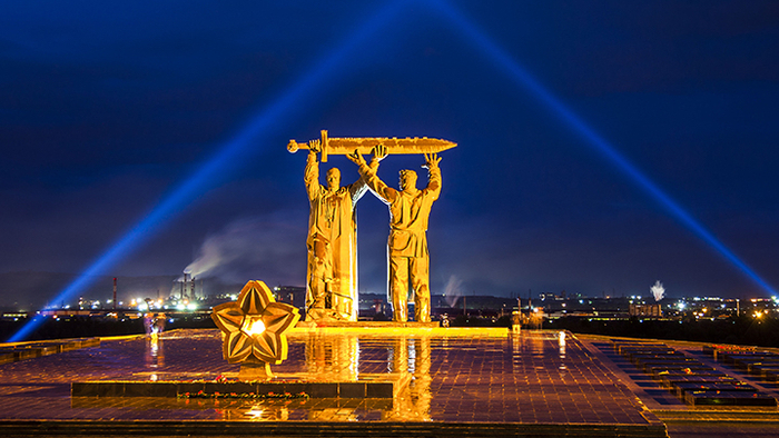 Первая часть триптиха расположена в Магнитогорске – ведь именно из местной стали в годы войны были сделаны каждый второй танк и каждый третий снаряд! Монумент называется «Тыл – фронту»: рабочий передает меч советскому воину.