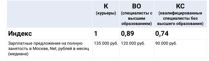 А теперь возьмем медианную зарплату курьера 135 тыс., ее реально получить, работая примерно по 12 часов с графиком 6/1 (312 часов в месяц), это примерно 433 руб/час. Возьмем также ЗП дипломированного специалиста в 120 тыс. рублей и среднее кол-во часов в месяц при 40- часовой рабочей неделе с графиком 5/2 – 170 часов, получим 706 руб/ час. С пересчетом на почасовую оплату труда зарплаты курьеров уже не выглядят столь внушительными, не правда ли?