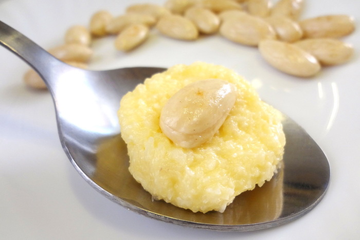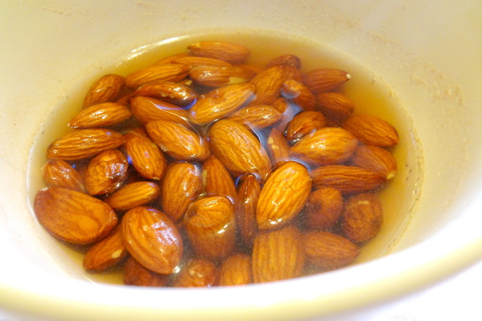 Незадолго до начала готовки, достаньте масло из холодильника на стол, чтобы оно размягчилось. При помощи вилки разминаем масло со щепоткой ванилина. Затем добавляем сгущенку и хорошо размешиваем. Туда же отправляем кокосовую стружку (часть откладываем для обсыпки готовых конфет). Обратите внимание, что если сгущенка у вас сильно жидкая, кокосовой стружки может понадобиться немного больше, чем указано в рецепте. Все хорошо перемешиваем и отправляем массу в холодильник на 2 часа. Пока кокосовая масса охлаждается, подготовим орехи. Миндаль заливаем крутым кипятком и оставляем на 5-7 минут, затем заливаем холодной водой.