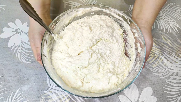 В глубокую миску выкладываем 780 г творога, всыпаем 30-35 г крахмала, добавляем 140 г сгущенного молока и 4 яичных желтка, пробить блендером до однородной массы. В творожную массу всыпаем 70 г кокосовой стружки, перемешиваем и отставляем в сторонку. В отдельную миску вливаем 4 яичных белка, добавляем щепотку соли и взбиваем миксером до белой пены, продолжая взбивать, добавляем 10 г ванильного сахара и продолжаем взбивать еще 2-3 минуты, до устойчивых белых пик. Полученные белки вмешиваем в творожную массу.