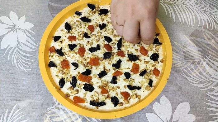 Форму диаметром 21 см смазываем сливочным маслом и выкладываем творожно-кокосовую массу, разравниваем и по желанию посыпаем измельченным грецким орехом, черносливом и курагой. Отправляем в разогретую духовку до 180 градусов и выпекаем 45-50 минут.