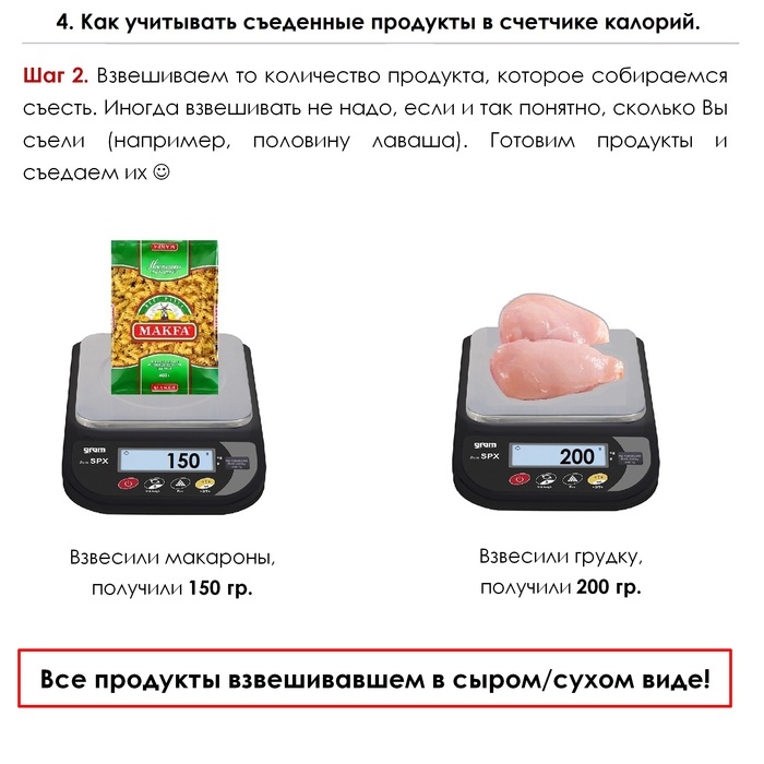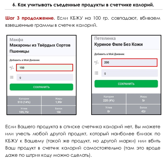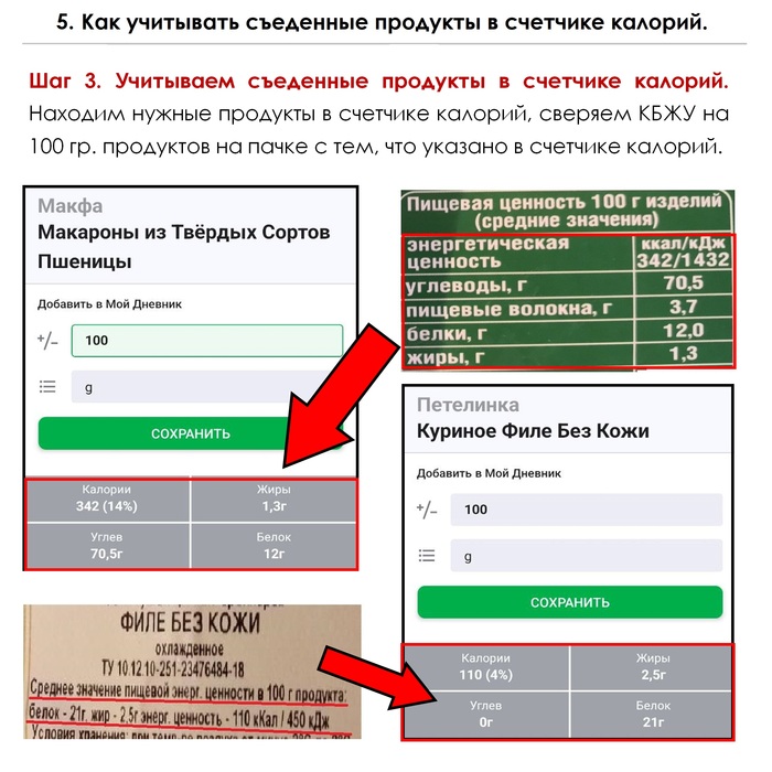 Казалось бы, это очевидный пункт, но многие полагаются на свои представления о продуктах, а не на этикетку. Например, часто приходится слышать мнение, что яйца — это чистый белок, хотя в них присутствует желток, который преимущественно состоит из жиров. Также не стоит обманываться фитнес-продуктами: те же протеиновые батончики содержат в составе далеко не один белок. Поэтому нужно опираться на данные с этикетки или, как вариант, смотреть состав в приложении FatSecret. Вообще, считаю его самым удобным приложением для подсчёта калорий.