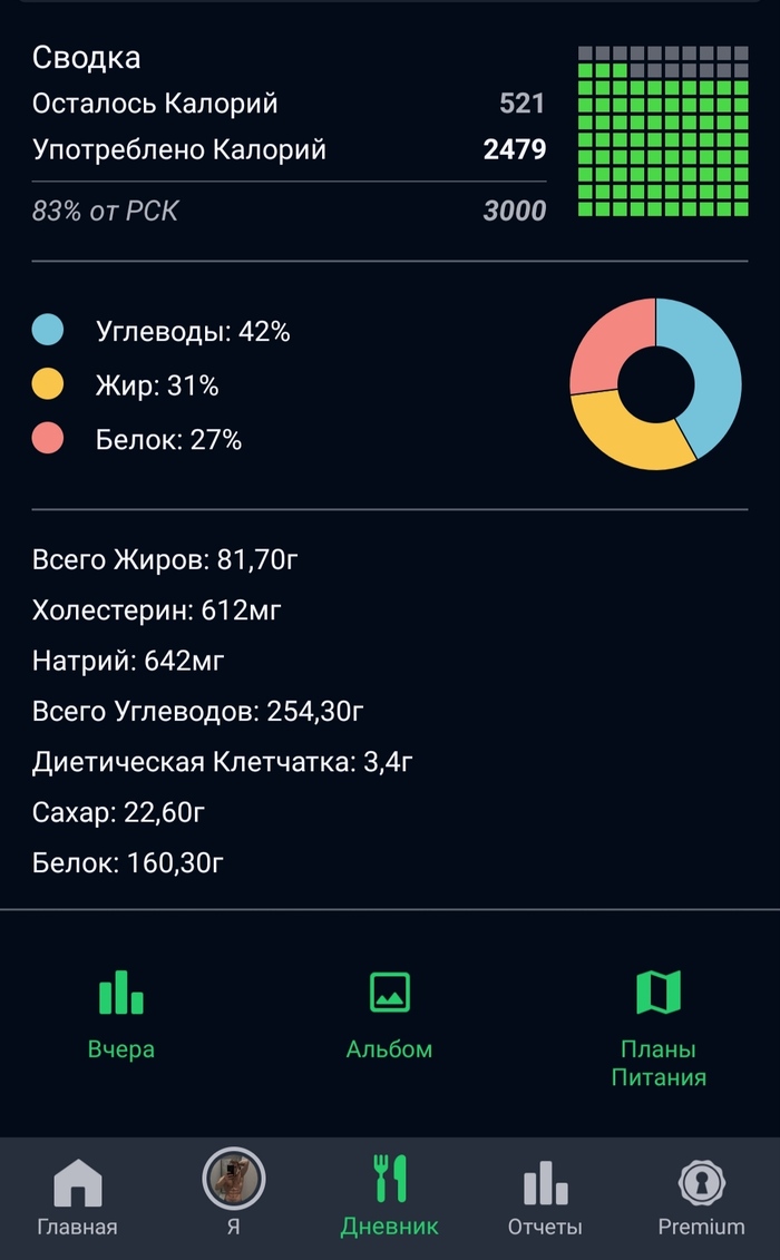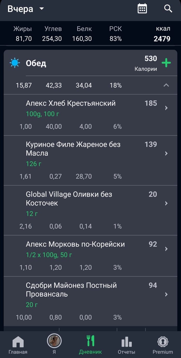 Итог за день: 2500кКал Б-160/Ж-81/У-254.
