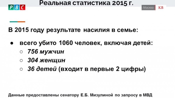 Если обратиться к реальным цифрам, то по данным МВД, полученным по запросу сенатора Елены Мизулиной, в 2015 году в результате насилия в семье всего убито 1060 человек, из них 756 мужчин и 304 женщины, 36 детей (входит в 1060). Заметьте, что убитых мужчин в два раза больше, чем женщин. Даже 304 убитые женщины – это очень трагично, но это не 14 тысяч. Тоже самое относится и к 36 детям. Да, каждый такой случай – трагедия. Но численность населения России – 144, 5 млн. человек. О каком «массовом» семейно-бытовом насилии идет речь? С чем надо бороться? Какие еще законы нужны и почему недостаточно тех, что есть?