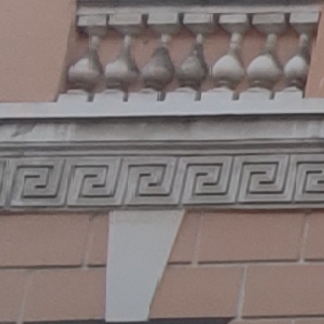 Солнышки с лицом по верхнему краю и пеликан кормящий детей, символ жертвенности (крестов если, что нет совсем), зато по периметру всех зданий вот такой обережный орнамент выше первого этажа.