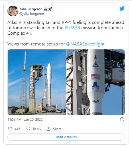 Первый полет United Launch Alliance и Atlas V в 2022 году, пятничный запуск начинает напряженный год как для компании, так и для ее ракеты. Следующий запуск Atlas V запланирован на начало марта вместе с метеорологическим спутником GOES-T для Национального управления океанических и атмосферных исследований. Другие предстоящие миссии включают давно отложенный второй испытательный полет космического корабля