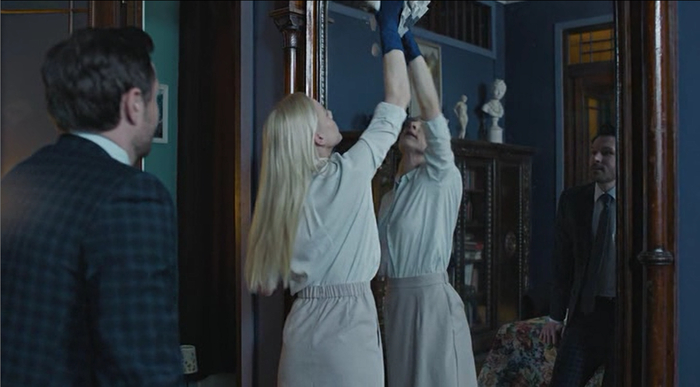 Затем идет копирование начальной сцены из фильма "Спасти рядового Района", камера медленно надвигается на лицо бабушки, потом бац, вместо старой женщины, стоит молодая девушка.