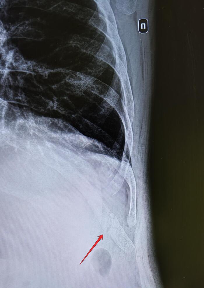 На Р-граммах левого гемиторакса: по паралопаточной линии визуализируется линия просветления(перелом) костной ткани 10го ребра. Диастаз 2мм.Нарастающая костная мозоль. Заключение: Консолидирующийся перелом 10го ребра слева.