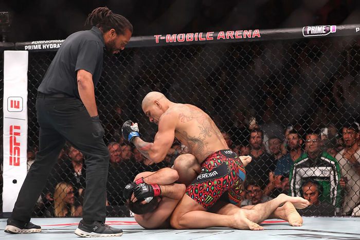 В первом бою Перейра все пять раундов осторожничал, но в реванше с первых секунд бросился в атаку. Он пытался вырубить Анкалаева, который не пошел в размен и работал вторым номером. А спустя всего минуту уронил чемпиона, застоявшегося у сетки. Попал дальней рукой за ухо и брутально добил локтями.