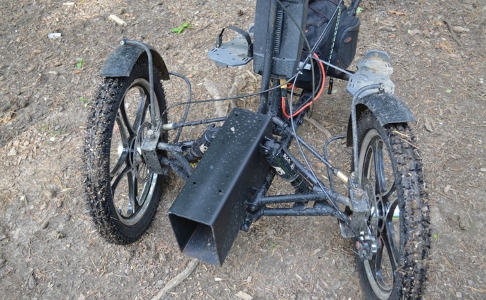Улучшения: удлинена рама, добавлены удобные подножки, все шаровые, болты, втулки - заменены, передние диски, резина - новые, по кругу газовые амортизаторы с регулировкой отскока, установлена хорошая батарейка. На штуке стало можно безопасно и относительно комфортно ездить. Да, высокий центр тяжести сильно напоминал о себе в поворотах, а подвеска от квадроцикла давала ужасный крен, но я как-то приноровился. Зато по бездорожью штука ехала почти отлично. Кончилось это довольно предсказуемо - я сломал единственную пятку. Да да, у меня правая нога электро-гидравлическая, отсюда и интерес к трехколесности.