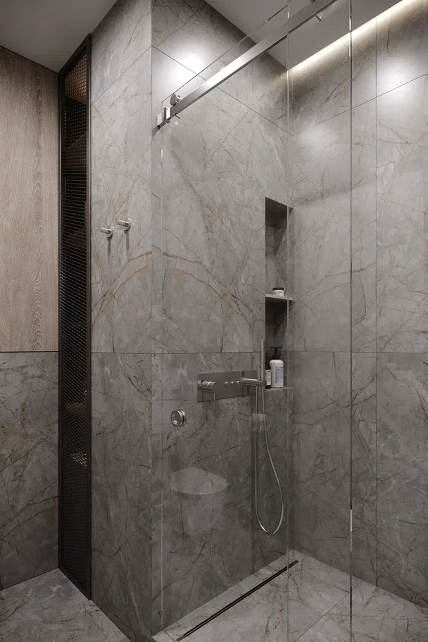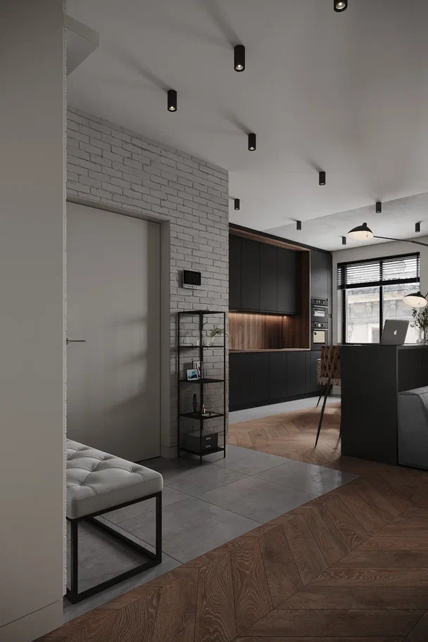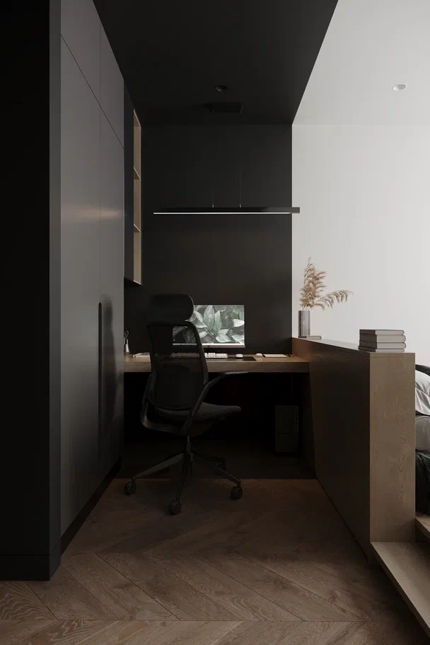 Минималистичное пространство для четырнадцатилетнего подростка оформлено с элементами лофт, площадь 16 квадратных метров. Широкая кровать 140 см, застеленная серым бельем и украшенная декоративными подушками, занимает одну из стен. Просторный рабочий стол длиной 150 см с игровым ПК и двумя экранами, дополнен RGB-подсветкой. Черное игровое кресло создает атмосферу геймерского уюта. Зеркальный шкаф-купе во всю стену зрительно расширяет помещение. В углу — гитара на подставке. Одна стена оформлена под кирпич, остальные окрашены в глубокий серый. Музыкальные постеры в рамках украшают стены. Металлический открытый стеллаж наполнен книгами и коллекционными фигурками. В зоне отдыха стоит торшер с регулируемым светом. Темный ламинированный пол, ковра нет. По периметру потолка — светодиодная лента. Основная палитра: серый, черный, белый, с акцентами неонового синего и фиолетового.