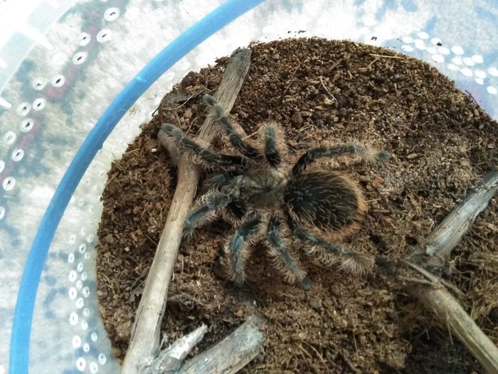 Свежевылинявшая самка Pterinopelma sazimai 7-й линьки. Уже начинает проявляться синева, но еще слабо заметно.