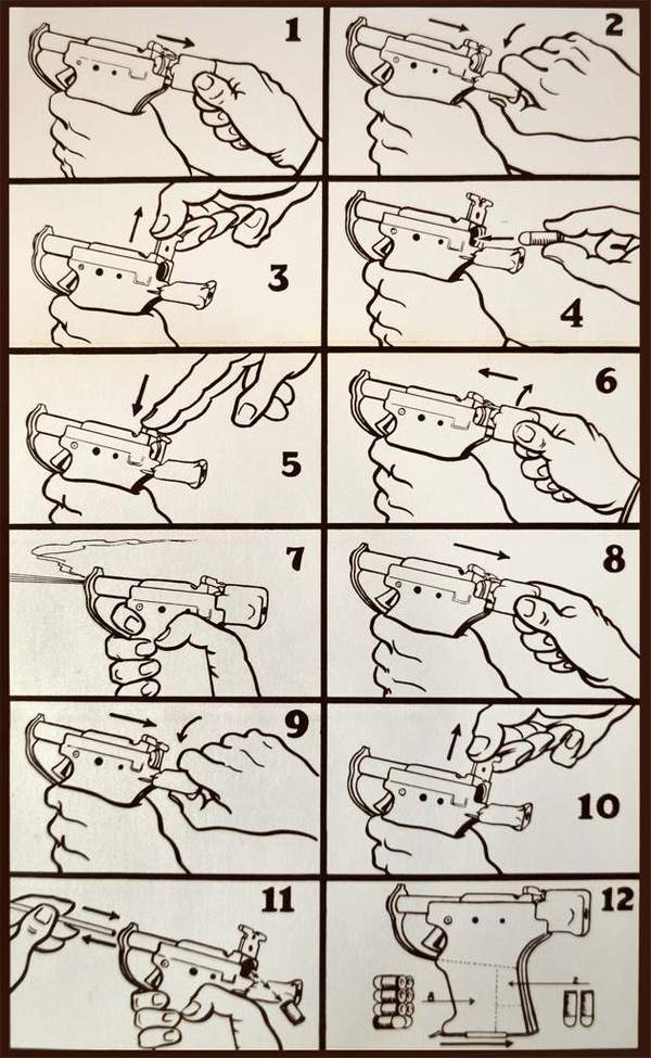 Ударно-спусковой механизм состоял из поворотного ударника, массивная задняя часть которого отливалась из цинка, с бойком посередине и штампованного спускового крючка со спусковой тягой. Внизу рукоятка имела закрывавшаяся сдвижной крышкой полость, в которой размещались десять запасных патронов. Эта полость не являлась магазином пистолета, а представляла собой носимый непосредственно в оружии своеобразный патронташ. 8 патронов были упакованы в пачку из водонепроницаемого картона, в то время как два других размещались отдельно от них, так как предполагалось, что после израсходования боекомплекта пистолет можно будет выбросить и далее использовать захваченное у противника «полноценное» оружие.