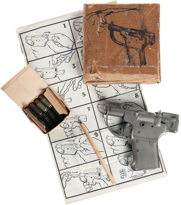 Результатом проведенных изысканий на эту тему стал заказ Объединенного Комитета психологической войны на малогабаритный однозарядный пистолет под штатный американский пистолетный патрон .45 АСР. В 1942 году комитет выдал начальнику отдела специальных операций УСС полковнику Престону Гудфеллоу рекомендацию о разработке максимально дешевого, технологичного и простого пистолета для вооружения партизан. Такое оружие было разработано конструкторской группой под руководством Джорджа Хайда, конструктора пистолета-пулемета M3 «Grease Gun», а проект получил кодовое название Flare Projector Caliber .45 («Флэр прожектор ФП-45», англ. «сигнальный пистолет»).