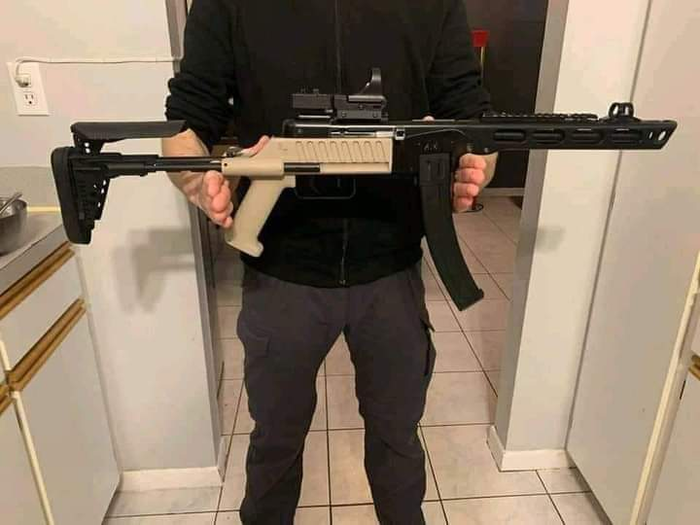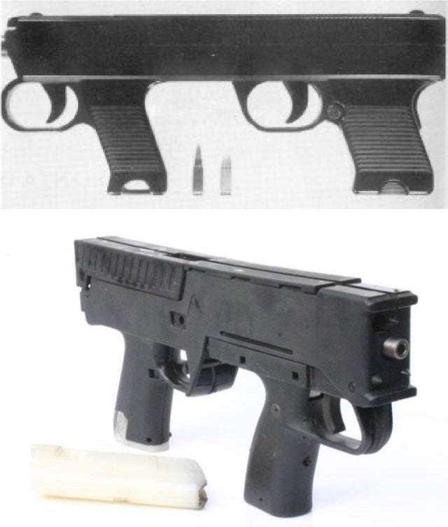 Пистолет-пулемет ТКБ-486 с прикладом, сложенным на ствольную коробку и ствол и с закрепленным под стволом коробчатым магазином - для скрытого ношения.