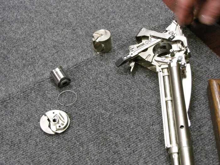 Из магазина патроны под давлением пружины подаются в барабан револьвера. Отверстия в нем расточены и лишены внешней стенки. Отчасти ее функцию выполняет сама гильза патрона, сдерживающая пороховые газы, отчасти рама пистолета, не дающая гильзе деформироваться при выстреле.