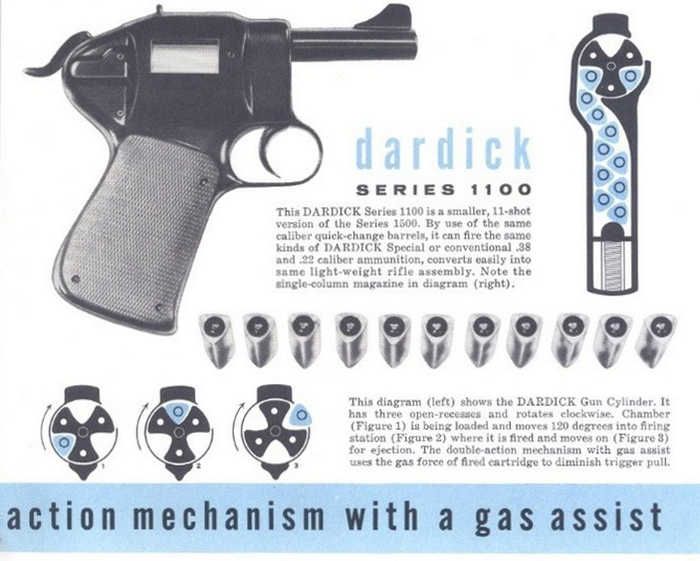 Компания «Dardick Corporation» занялась выпуском вполне оригинальных неавтоматических пистолетов, у которых были трехместные барабаны с треугольными пазами, выполняющие роль патронника, а так же в рукоятке несъемный магазин. В магазин помещались патроны «траунд» вручную по одному патрону или при помощи специального ускорителя – обоймы на 10 штук. «Dardick Corporation» предлагала три варианта пистолетов «Dardick».