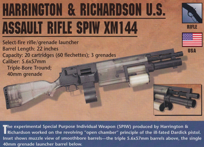 Экспериментальная винтовка H&R SPIW должна была использовать Tround патрон с тремя пулями-дротиками, наподобие тех оперённых подкалиберных снарядов, что сегодня выпускают по бронетехнике.