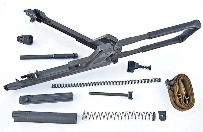 Первые образцы были оснащены неотъёмным деревянным прикладом, позже его сменил рамочный складывающийся.