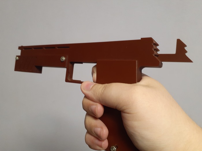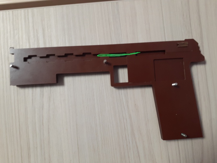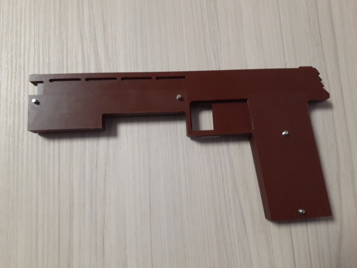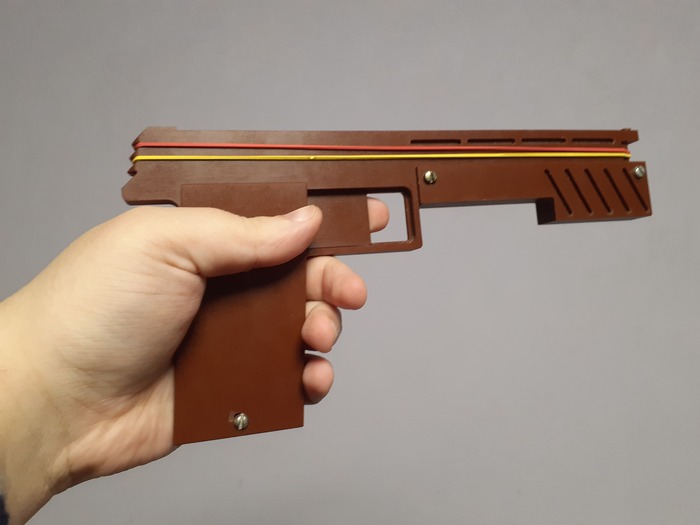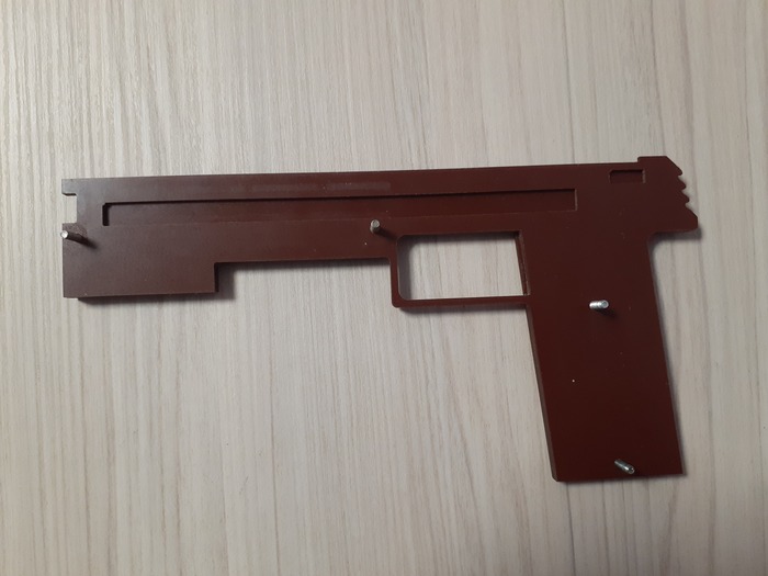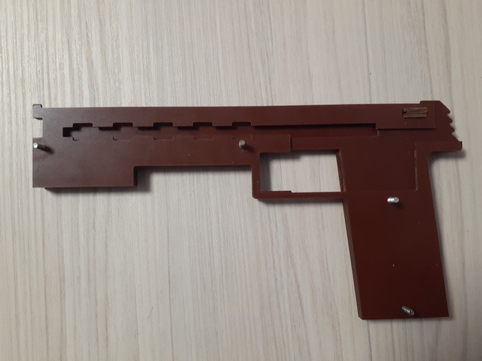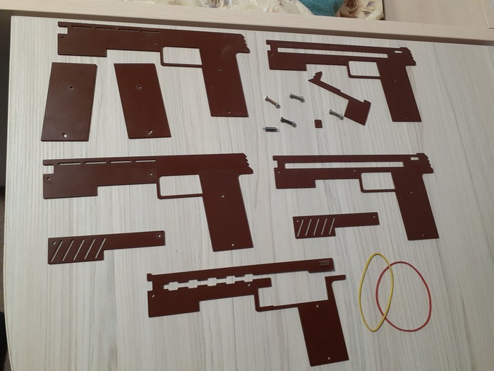 В виду своей рабочей деятельности как оператор станков с ПУ, имею доступ к станкам, материалам и что самое главное к программам-редакторам типа CAM 350. В один прекрасный момент лета 2020 года, из-за отсутствия больших объёмов работ, смастЫрил резинкострел из гетинакса (пресованная бумага). Данный образец заказывался поштучно и имеет номер изменения 4, а это значит что предыдущие 3 были неработоспособны и утилизированы. Внешний вид изделия был основан на пистолете Робокопа из кинофильма 1987 года режиссера Пола Верховена и 10-мм пистолете «Кольт» 6520 из видеоигр Fallout и Fallout 2.