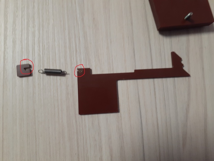 Затем устанавливается основной слой А0 и сам механизм спускового крючка. Заранее установленная шпонка обведена красным кругом. Слой необходим для направления и удержания спускового крючка внутри изделия. А так же для регулировки натяжения пружины (ведь эта пружина может со временем растянутся). Специально было сделано 5 позиций для фиксирования крючка который удерживает пружину с одной стороны. Другая сторона пружины удерживается крючком сделанным в спусковом крючке (пиздец понаписал).