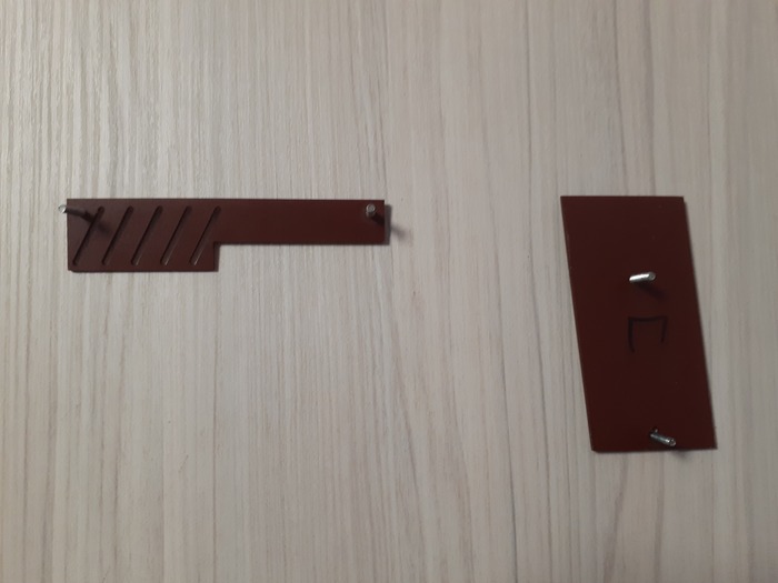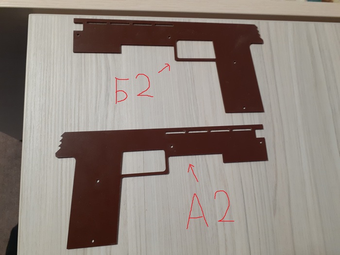 Далее на эти болты устанавливается слой Б2. Слои Б2 и А2 изготавливаются абсолютно одинаково, по одной рабочей программе. На последующей операций, с помощью напильника и надфиля, сглаживаются все углы в задней части слоя, там где курок перемещает резинку на следующую позицию. Оба слоя нужны для удержания пружины внутри изделия.
