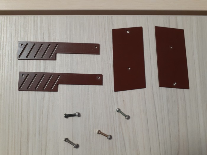 Все начинается с 4 болтов которые устанавливаются в две детали. Это рукоятка и декоративное цевьё. Изделие изготавливалось для удобной эксплуатаций заказчиком (т.е. для меня), и имеет дополнительные слои для создания нужной толщины рукоятки (толщина гетинакса 2 мм, изделие имеет 7 слоев, значит общая толщина в рукоятке 14 мм что вполне комфортно для моей руки) и слои в виде декоративного цевья для создания дополнительного веса в передней части изделия.
