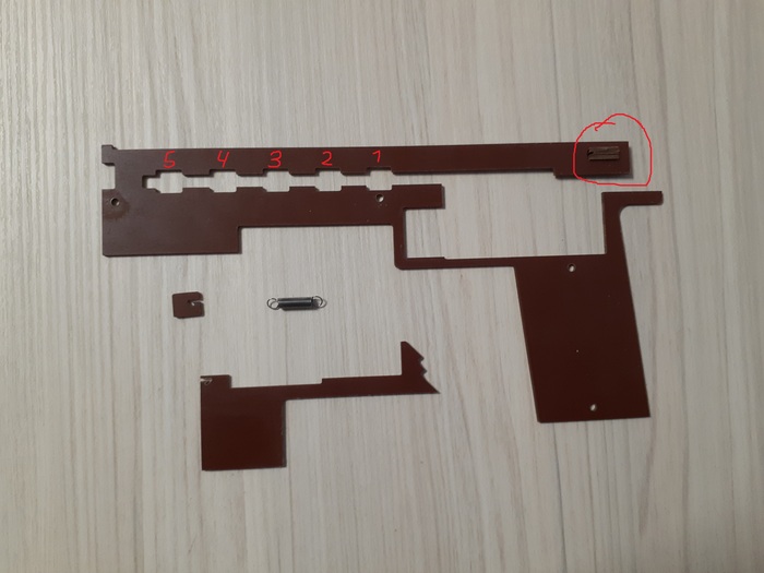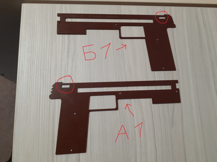 Следом на болты устанавливается слой Б1. Этот слой так же нужен для удержания пружины и спускового крючка внутри изделия. Слои Б1 и А1 полностью одинаковы и в никакой дополнительной обработки не нуждаются. Их можно спокойно менять местами. Имеют пазы для установки шпонки (обозначено красным кругом). Предыдущие образцы имели в этом месте болтовое соединение. Резинки цеплялись за шляпку болта и гайку что не способствовало к удобному пользованию. Элегантная замена на шпонку исправило этот дефект.