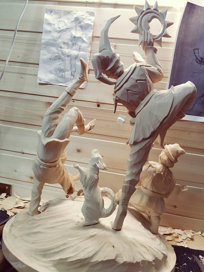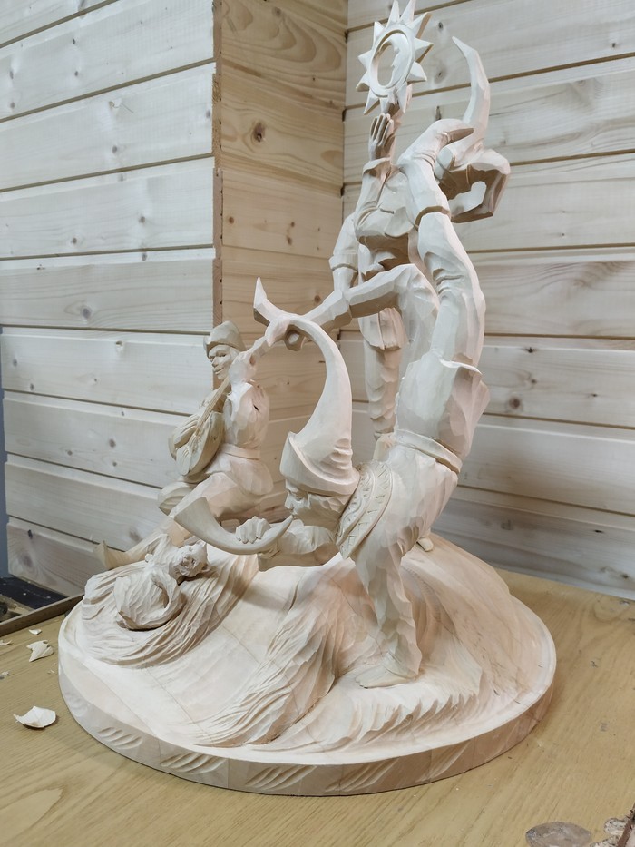 Много фигурная композиции под названием "живи здесь и сейчас" выполнена из древесины липы, с применением богородских приёмов разных веков. За основу взят скоморох как ярчайший образ русской импровизации. Именно его образ призывает нас жить в моменте;)… если будет интересно я могу конкретнее рассказать про каждого из трёх скоморохов и кота с собакой