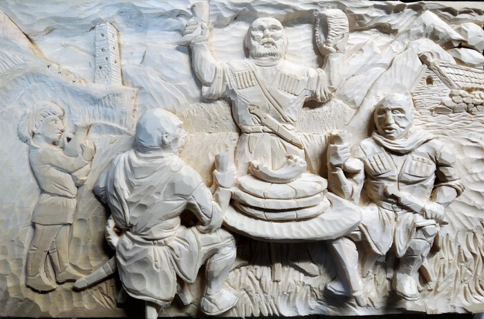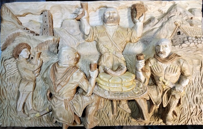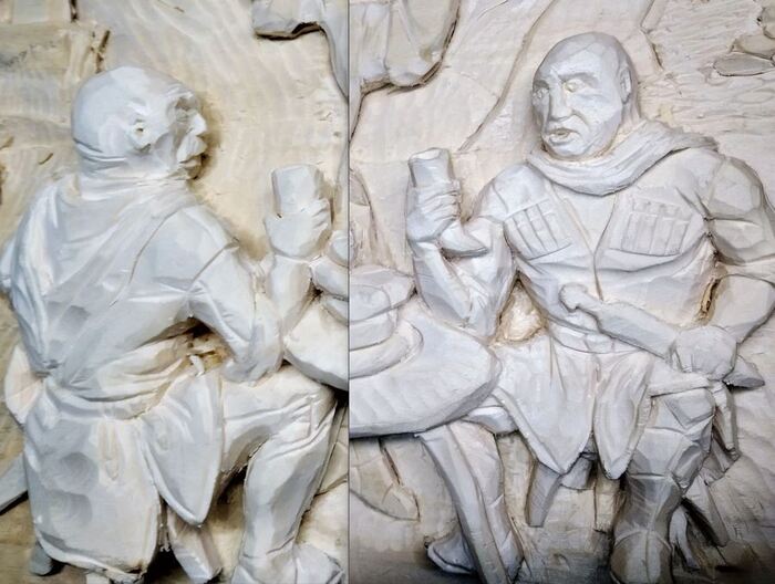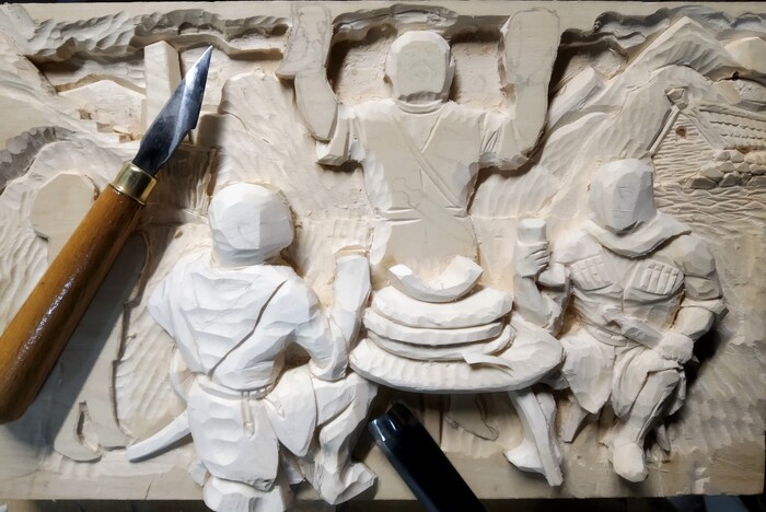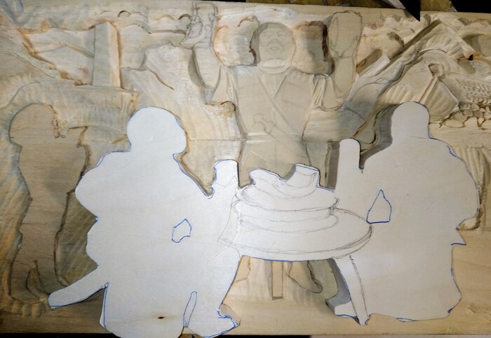 Начал черновую проработку основы (фона) барельефа. Для усиления эффекта объема (доска была толщиной 16 мм) добавил часть переднего плана: