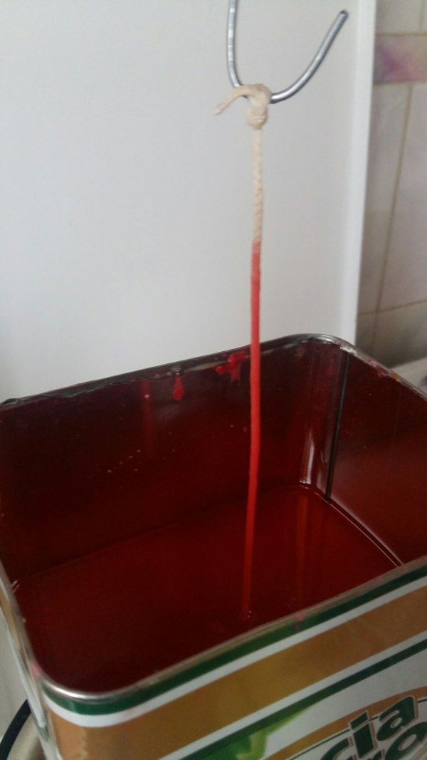 Когда красного (в моем случае) достаточно. Погружаю в белый , раз 5 .Чтобы свеча стала белой.