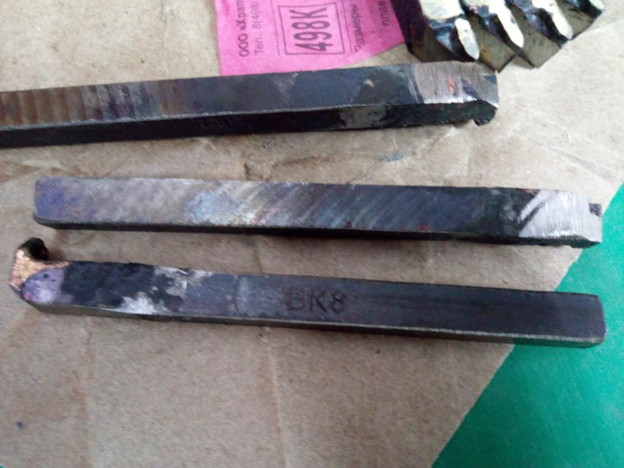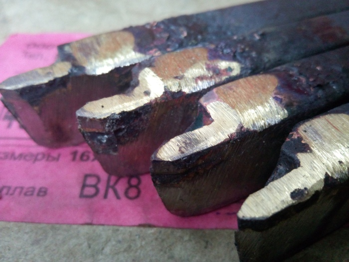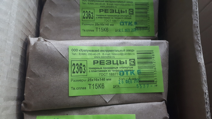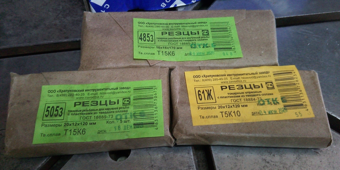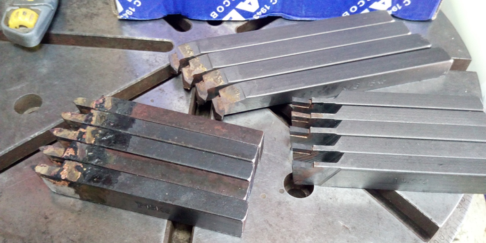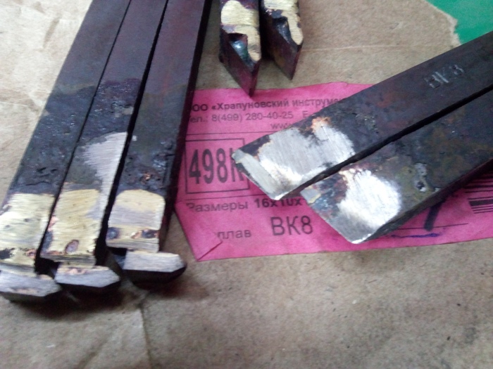 Внуренние резьбовые, являют, по качеству, нечто среднее между "продукцией конкурентов" и отрезными резцами. По ним видно, что пытались паять аккуратно и даже почти весь припой с пластинок убрали, ключевое слово почти, но это мелочи на фоне прошлых резцов. Увы три из четырех пришли со сколами, но это не самое страшное, два поправятся на алмазе, а один превратится во внутренний канавочный. Веселее было, когда я открыл резцы для внешней резьбы, открывал я их именно в такой последовательности, так что все чувства и эмоции идентичны натуральным сохранены.