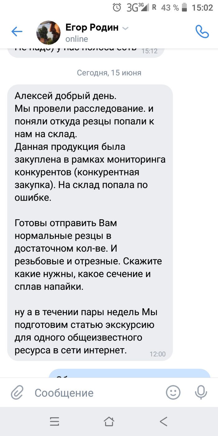Связался я с представителем завода, Егором Родиным, сбросил фото резцов и счет-фактуры