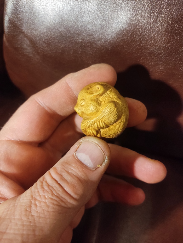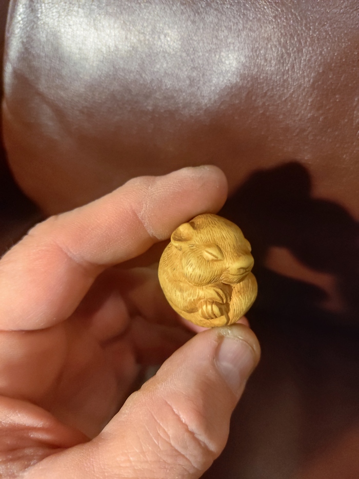 Нэцкэ и картхолдер. Сначала вырезал из кусочка самшита нэцкэ( брелок, по-нашему) , спящую ореховую соню( животина такая, до ужаса милая) .