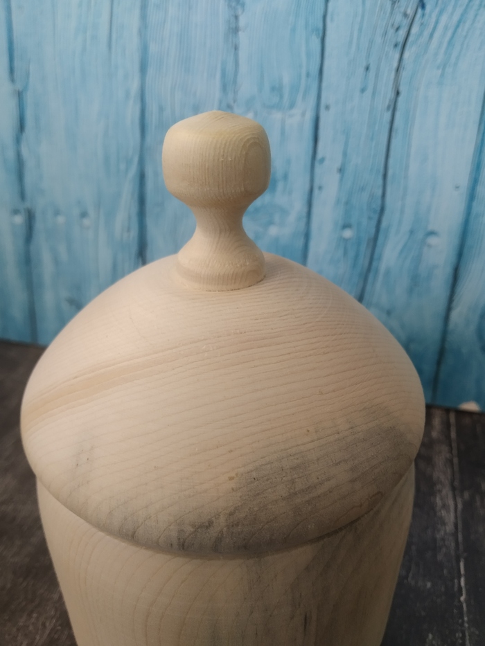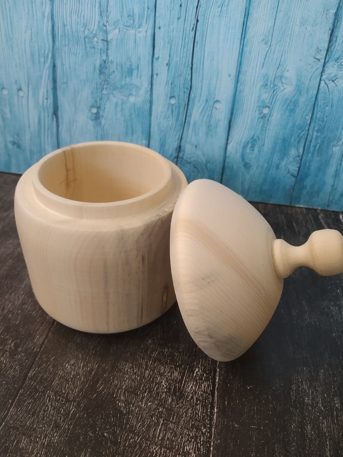 Абсолютно сухая сосновая солонка, диаметром 9 см, общей высотой 15 см, 9 см без крышки.