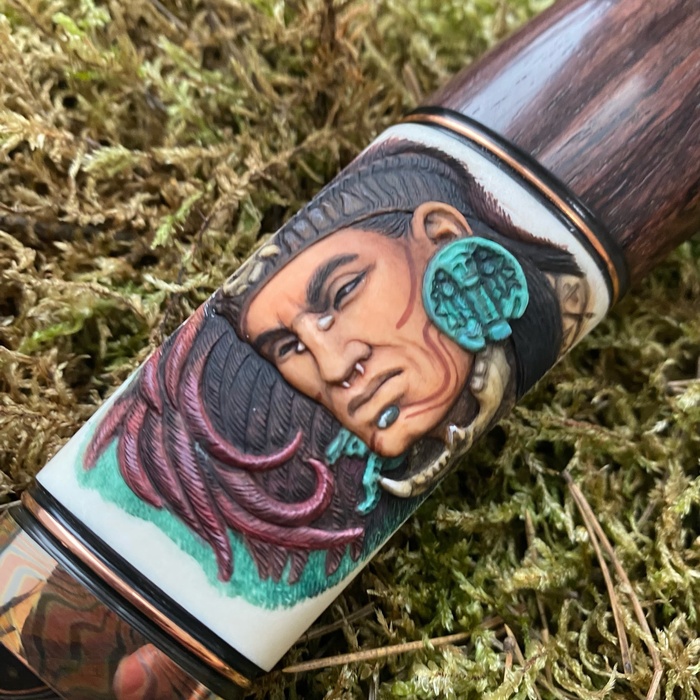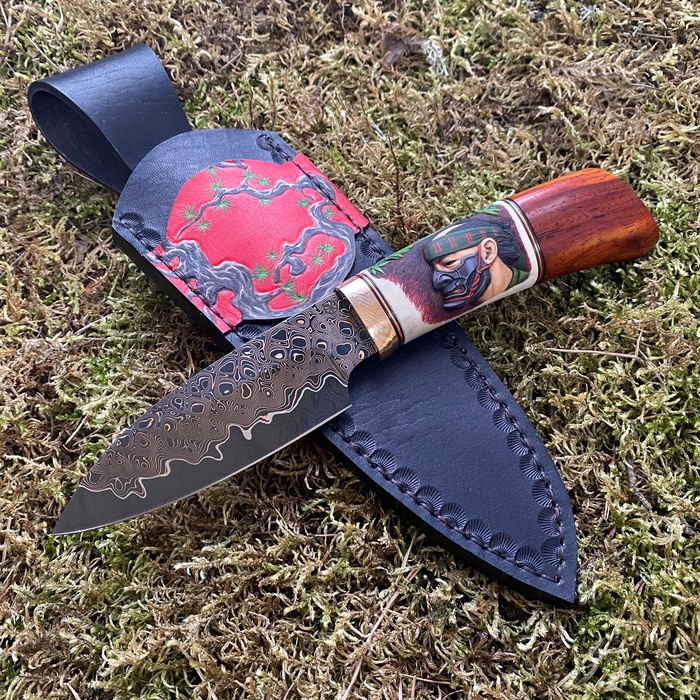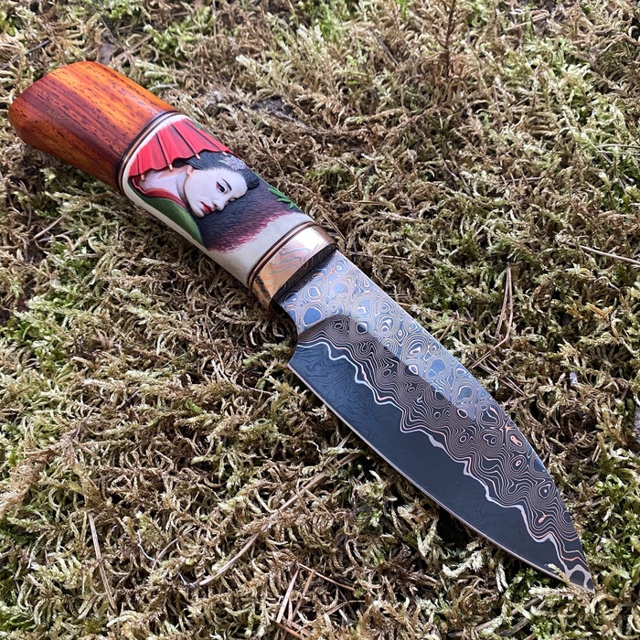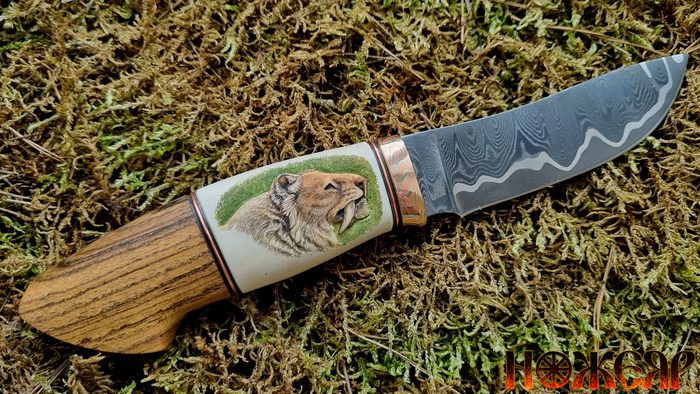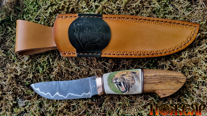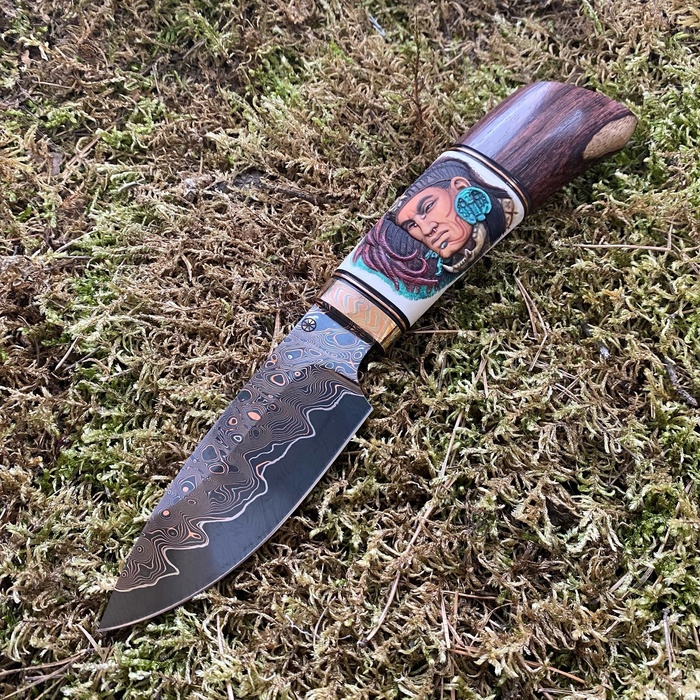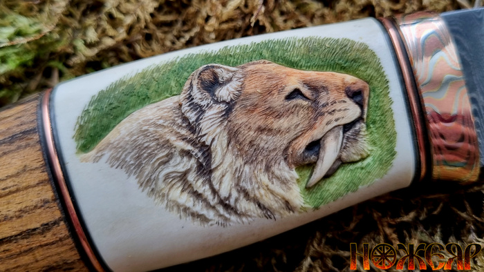 Рукоять - рог лося, бокоте. Объемная резьба с колороированием акрилами. Проставки - медь и фибра
