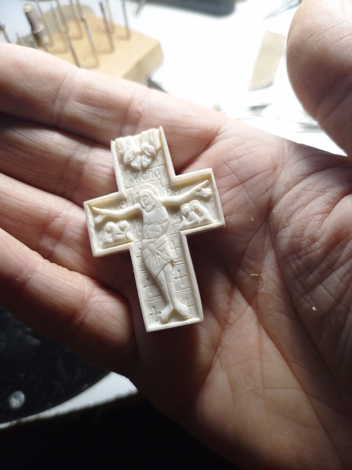 Подруга сегодня закончила, не могу не поделиться. Сделан из рога лося, борода и брови из эбена, глаза бивень мамонта и розовое дерево. Будет висеть в машине)