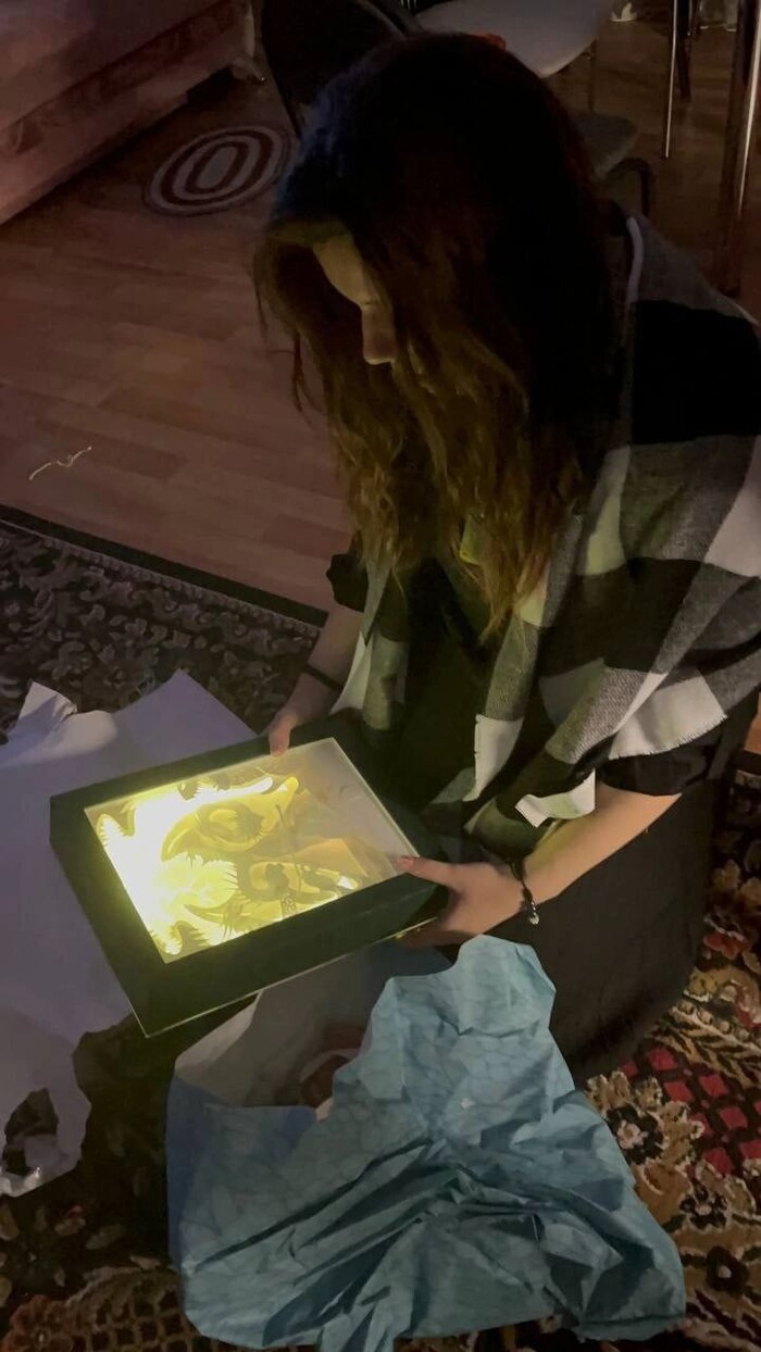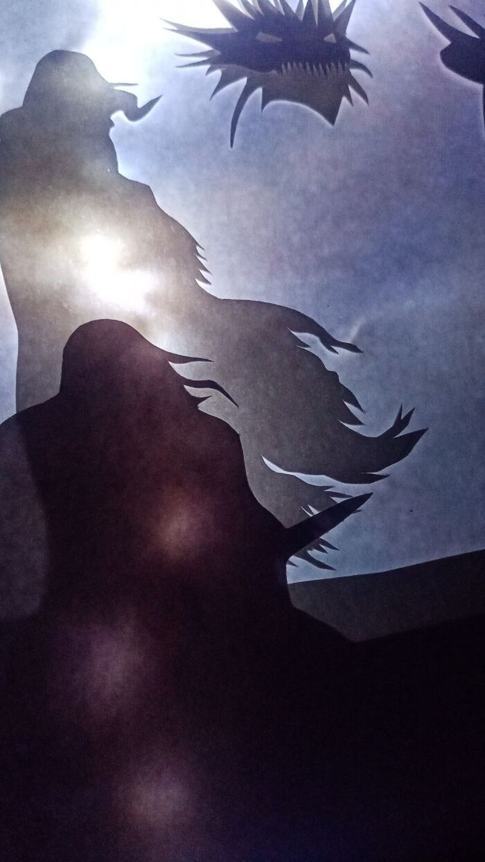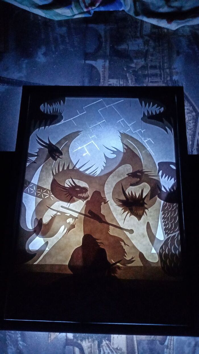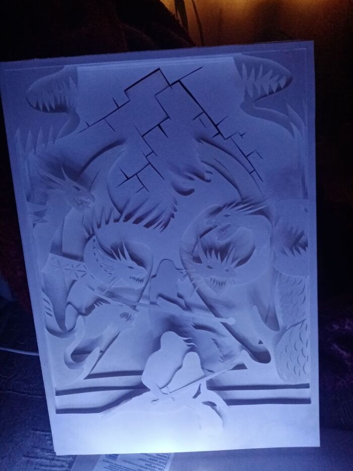 Замучалась вырезать все это, сил уже не было, но была идея и несколько человек которым очень хотелось увидеть результат. Примеряла свои вырезки на книжке+гирлянда+белый лист, смотрела как все светится. В конце, кстати, оказалось что бумага у меня вообще трех разных оттенков, но в итоговом виде этого не видно.