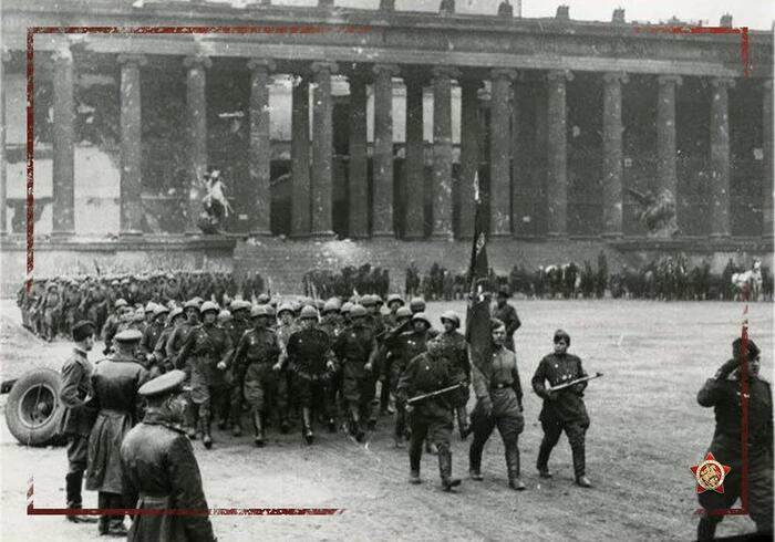 Кстати, по легенде, в качестве материала для знамени была использована красная скатерть, а серп, молот и звезда были вырезаны из белой бумаги и пристрочены накануне отъезда Халдея из Москвы в Берлин.