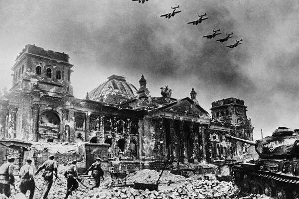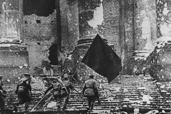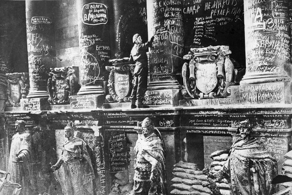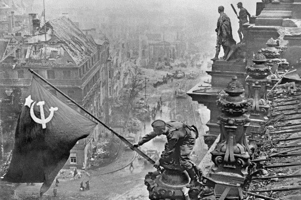 Этот всемирно известный снимок, иллюстрирующий поверженную Советским Союзом Германию, из серии фотографий «Знамя Победы над рейхстагом» был сделан советским военным фотокорреспондентом Евгением Ананьевичем Халдеем (1916–1997) по заданию ТАСС 2 мая 1945 года.