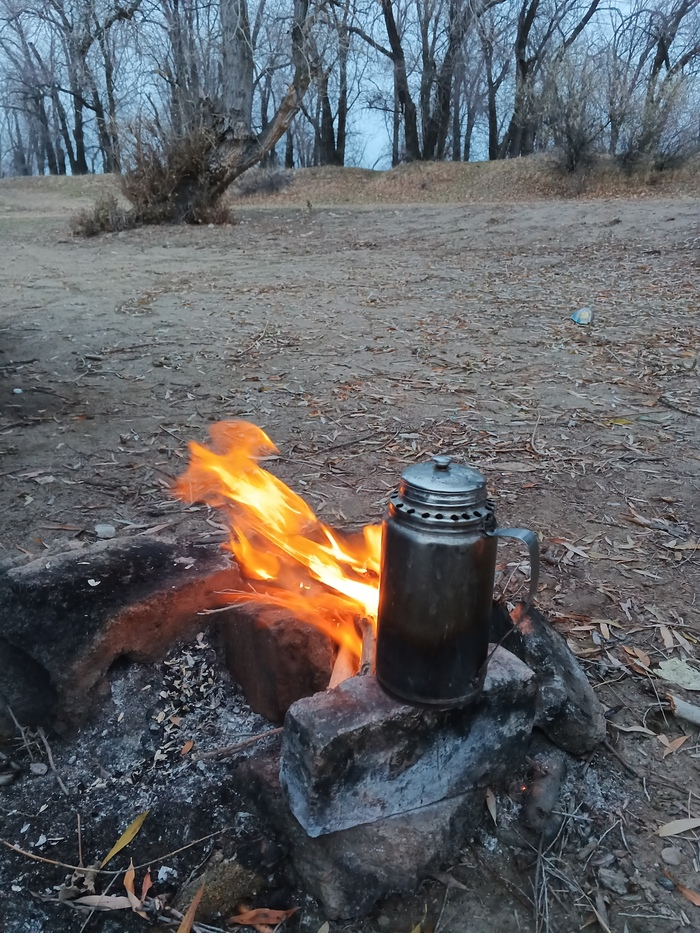 Сжигаем мусор и за одно греем воду на вечерние процедуры. Сухих веток завались!