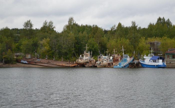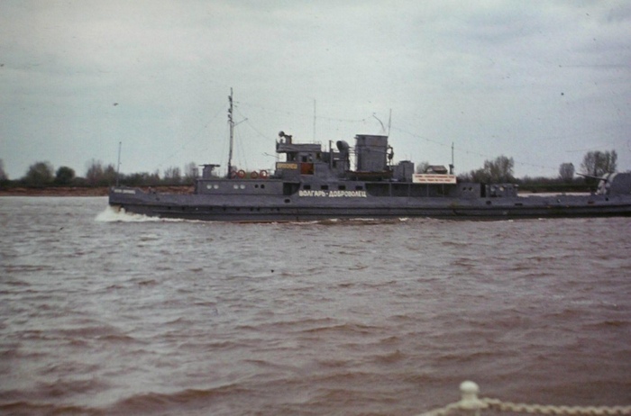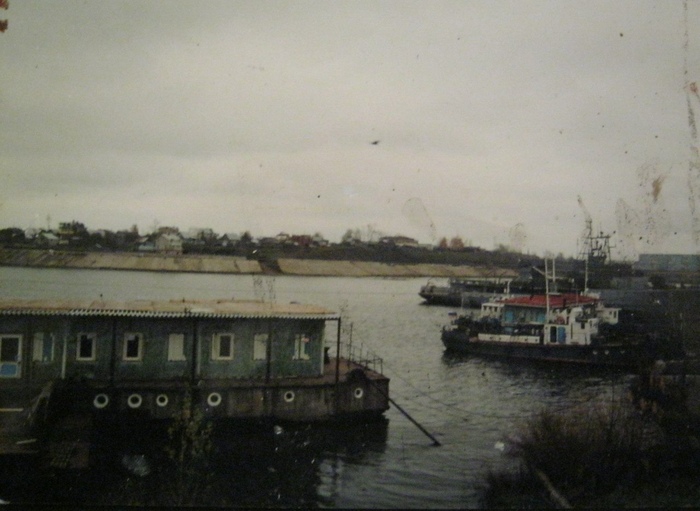 Вспомогательные суда, причал, паром. Справа позади серый силуэт - тральщик Североморец. Часть истории Набережных Челнов.