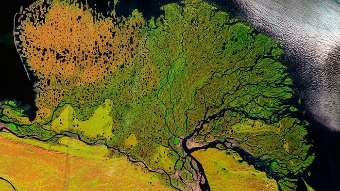 Именно здесь заканчивается Лена и начинается ее колоссальная дельта, раскинувшаяся на 300 километров вдоль берега и уходящая на 150 км в сторону моря Лаптевых. Оно же, как считают гидрологи, и повинно в образовании столь разветвленного устья. Во время последнего оледенения (примерно 11 тысяч лет назад) море Лаптевых (точнее его прародитель) частично отступило на север, а река, подпруженная ледниками, заполнила наносами гигантскую котловину. Позже, когда лёд растаял, эти отложения сформировали основу дельты. Сегодня её протоки ежегодно выносят в океан 15 млн тонн наносов, продолжая «строительство» все новых островов.