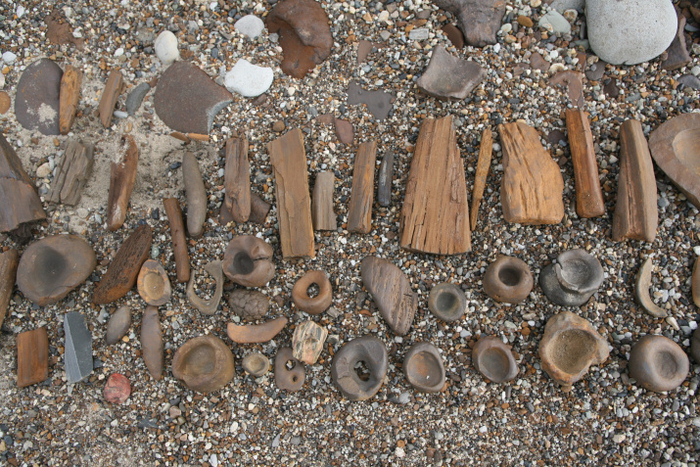 У подножия берегового уступа обычны остатки окаменелой древесины, конкреции различной формы и величины.